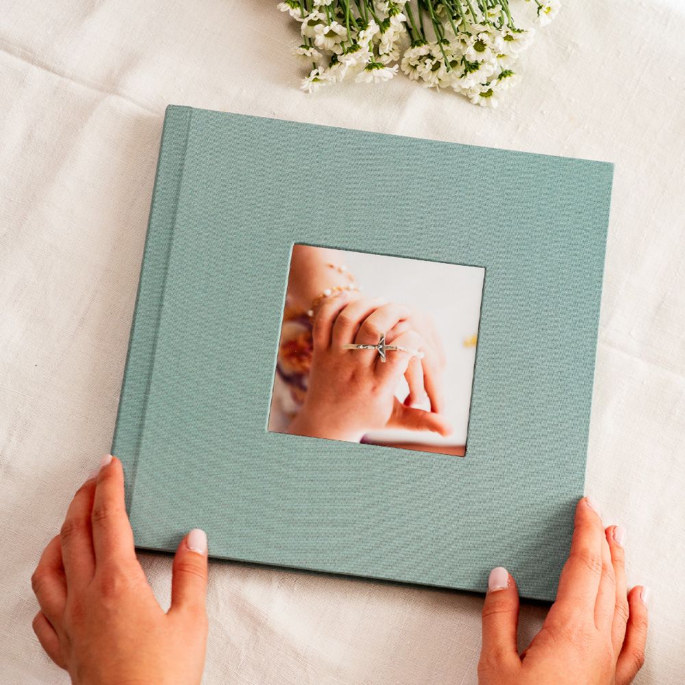 No modelo Cameo, a capa abre uma janela para a emoção. A tua fotografia favorita é integrada de forma permanente na capa em tecido, criando um leve relevo que a transforma no coração do álbum e num convite imediato para descobrir as memórias que guarda no interior.
